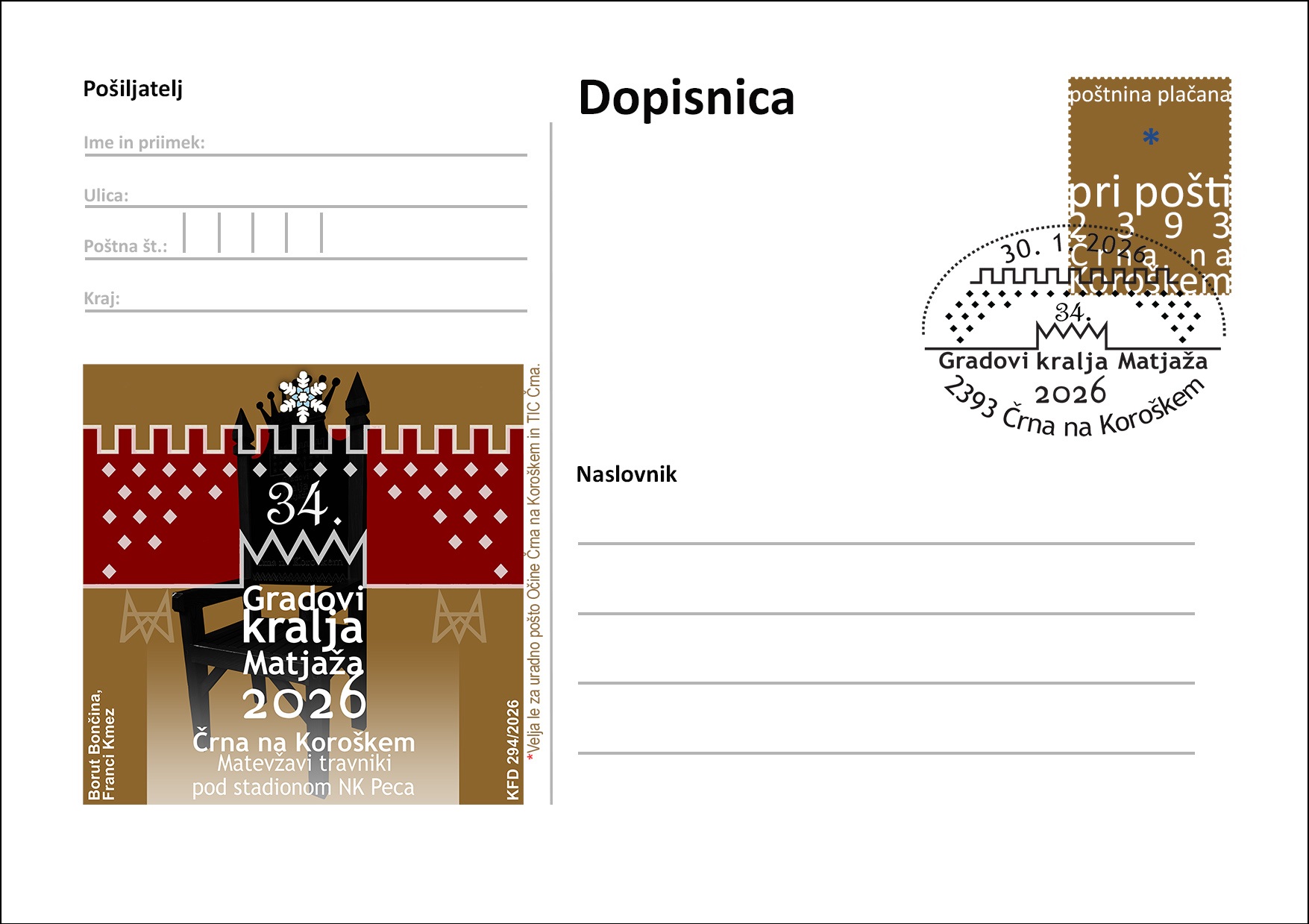 In ponovno se nadaljuje navada filatelističnega obeleževanja tega dogodka, ko bo v petek, 30. 1. 2026, na pred-dan/predvečer gradenj snežnih gradov poleg rednega poštnega žiga, na pošti 2393 Črna na Koroškem že trinajstič zapored v uporabi tudi priložnostni poštni žig. Moralo bi biti že štirinajstič, a je bila lanska filatelistična izdaja, vključno s poštnim žigom uradno odpovedana. Občina Črna na Koroškem bo poleg poštnega žiga izdala tudi ilustrirano dopisnico (KFD (294/2026), sočasno pa bo Koroško filatelistično društvo (KFD) samostojno in v butični nakladi izdalo še priložnostno pisemsko ovojnico (KFD 293/2026) ter osebno poštno znamko (nominala A). Priložnostni poštni sklop, ki ga zaokrožuje priložnostna filatelistična razstava (Jože Keber, KFD), postavljena v prostorih Pošte 2390 Črna na Koroškem, je že štirinajstič zapored oblikoval arh. Borut Bončina, so-avtor priložnostnega poštnega žiga je Peter Močnik. Izhodiščni motiv sklopa je lesen »Matjažev« prestol, ki ga je pred par leti izdelal Franci Knez in krasi avlo Občine Črna na Koroškem.