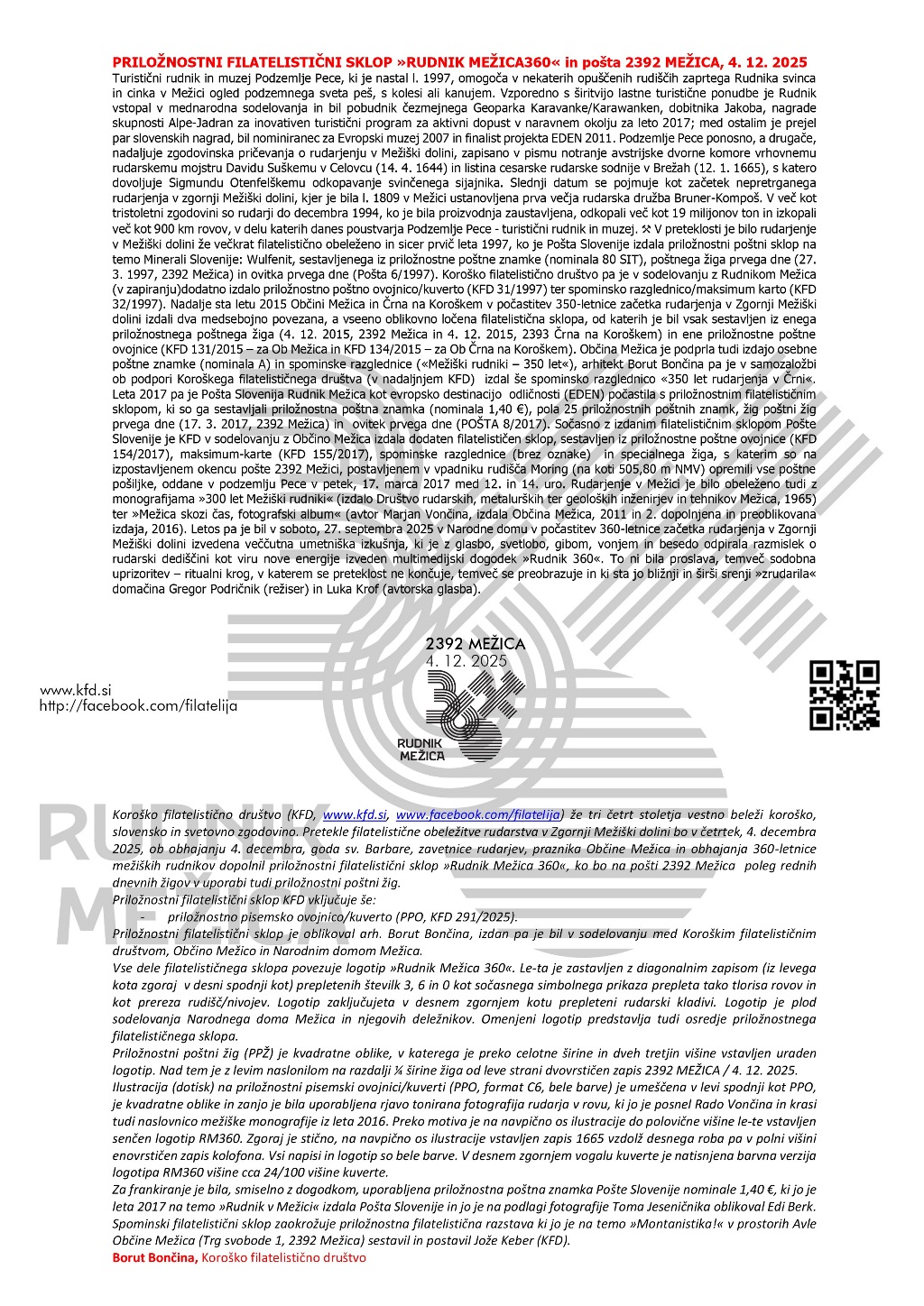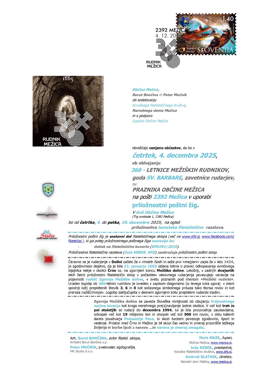 Ob obhajanju 4. decembra, goda sv. Barbare, zavetnice rudarjev, praznika Občine Mežica in obhajanja 360.letnice mežiških rudnikov je Koroško filatelistično društvo ob podpori Občine Mežica in JKZ Narodnega doma Mežica v četrtek, 4. 12. 2025 pripravilo priložnostni filatelistični sklop, sestavljen iz priložnostnega poštnega žiga, uporabnega na pošti 2392 Mežica in priložnostne pisemske ovojnice/kuverte.